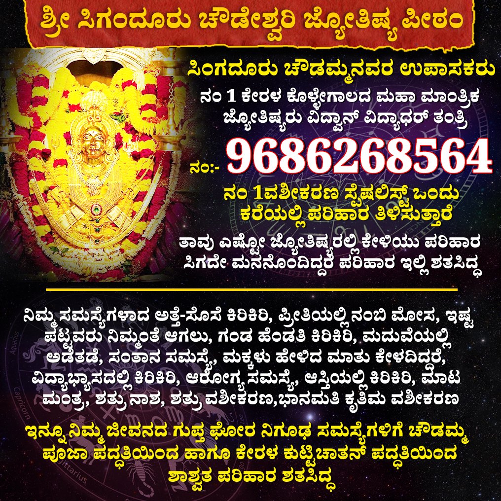ವೇದ ಬ್ರಹ್ಮ ವಿದ್ವಾನ್ ವಿದ್ಯಾಧರ್ ತಂತ್ರಿ ನಂ:- 9686268564 ಒಂದು ಕರೆಯಲ್ಲಿ ಪರಿಹಾರ ತಿಳಿಸುತ್ತಾರೆ ತಾವು ಎಷ್ಟೋ ಜ್ಯೋತಿಷ್ಯರಲ್ಲಿ ಕೇಳಿಯು ಪರಿಹಾರ ಸಿಗದೇ ಮನನೊಂದಿದ್ದರೆ ಪರಿಹಾರ ಇಲ್ಲಿ ಶತಸಿದ್ಧ ನಿಮ್ಮ ಸಮಸ್ಯೆಗಳಾದ ಅತ್ತೆ-ಸೊಸೆ ಕಿರಿಕಿರಿ, ಪ್ರೀತಿಯಲ್ಲಿ ನಂಬಿ ಮೋಸ, ಇಷ್ಟ ಪಟ್ಟವರು ನಿಮ್ಮಂತೆ ಆಗಲು, ಗಂಡ ಹೆಂಡತಿ ಕಿರಿಕಿರಿ, ಮದುವೆಯಲ್ಲಿ ಅಡೆತಡೆ, ಸಂತಾನ ಸಮಸ್ಯೆ, ಮಕ್ಕಳು ಹೇಳಿದ ಮಾತು ಕೇಳದಿದ್ದರೆ, ವಿದ್ಯಾಭ್ಯಾಸದಲ್ಲಿ ಕಿರಿಕಿರಿ, ಆರೋಗ್ಯ ಸಮಸ್ಯೆ, ಆಸ್ತಿಯಲ್ಲಿ ಕಿರಿಕಿರಿ, ಮಾಟ ಮಂತ್ರ, ಶತ್ರು ನಾಶ, ಶತ್ರು ವಶೀಕರಣ, ಭಾನಮತಿ ಕೃತಿಮ ವಶೀಕರಣ ಇನ್ನೂ ನಿಮ್ಮ ಜೀವನದ ಗುಪ್ತ ಘೋರ ನಿಗೂಢ ಸಮಸ್ಯೆಗಳಿಗೆ ಚೌಡಮ್ಮ ಪೂಜಾ ಪದ್ಧತಿಯಿಂದ ಹಾಗೂ ಕೇರಳ ಕುಟ್ಟಿಚಾತನ್ ಪದ್ಧತಿಯಿಂದ ಶಾಶ್ವತ ಪರಿಹಾರ ಶತಸಿದ್ಧ ಜ್ಯೋತಿಷ್ಯರು ವಿದ್ವಾನ್ ವಿದ್ಯಾಧರ್ ತಂತ್ರಿ ನಂ:- 9686268564