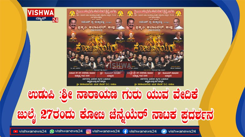 ಉಡುಪಿ : ಶ್ರೀ ನಾರಾಯಣ ಗುರು ಯುವ ವೇದಿಕೆ – ಜುಲೈ 27ರಂದು ಕೋಟಿ ಚೆನ್ನೆಯೆರ್ ನಾಟಕ ಪ್ರದರ್ಶನ – vishwanews24