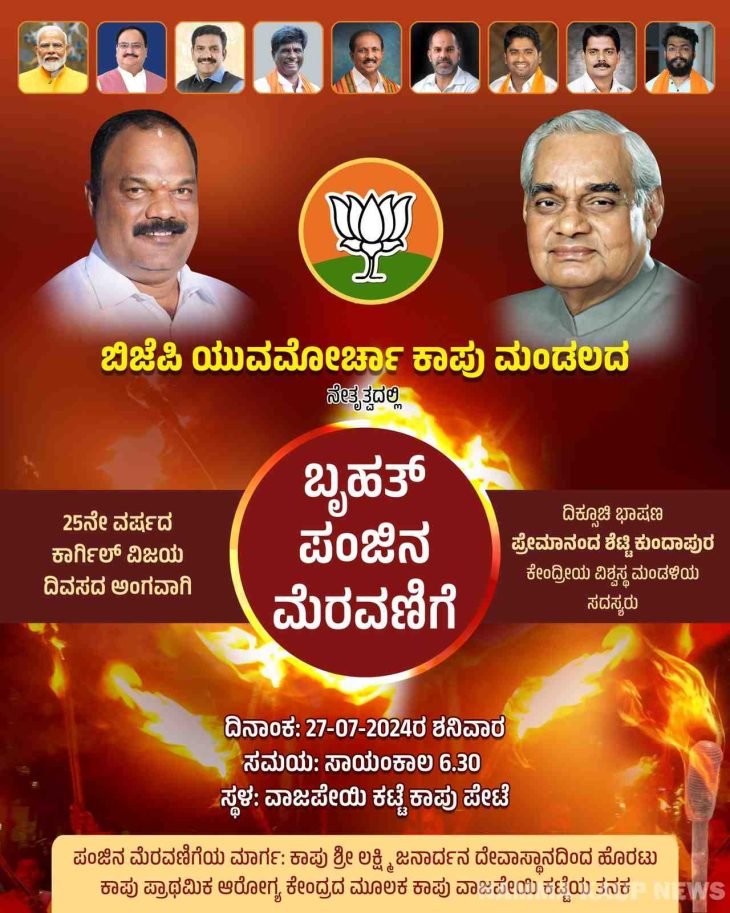 ಕಾಪು : ಬಿಜೆಪಿ ಯುವಮೋರ್ಚ ಕಾಪು ಮಂಡಲದ ವತಿಯಿಂದ ಇಪ್ಪತ್ತೈದನೇ ವರ್ಷದ ಕಾರ್ಗಿಲ್ ವಿಜಯ ದಿವಸ ಅಂಗವಾಗಿ ಬೃಹತ್ ಪಂಜಿನ ಮೆರವಣಿಗೆ ಜುಲೈ 27ರಂದು ಸಂಜೆ 6.30ಕ್ಕೆ ಕಾಪು ಶ್ರೀ ಲಕ್ಷ್ಮೀ ಜನಾರ್ದನ ದೇವಸ್ಥಾನದಿಂದ ಹೊರಟು ಪ್ರಾಥಮಿಕ ಆರೋಗ್ಯ ಕೇಂದ್ರದ ಮೂಲಕ ಕಾಪು ವಾಜಪೇಯಿ ಕಟ್ಟೆಯ ತನಕ ನಡೆಯಲಿದೆ.