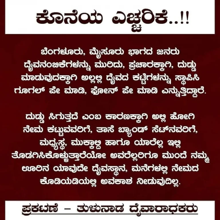 ತುಳುನಾಡ ದೈವಾರಾಧಕರು ಎಚ್ಚರಿಕೆ ನೀಡಿದ ಫೋಟೋ ಒಂದು ವೈರಲ್ ಆಗಿದೆ. ಸಾಮಾಜಿಕ ಜಾಲತಾಣದಲ್ಲಿ ಹರಿದಾಡುತ್ತಿದೆ. ಆದ್ರೆ ಈ ಬಗ್ಗೆ ಯಾವುದೇ ಸ್ಪಷ್ಟನೆ ದೊರೆತಿಲ್ಲ.
