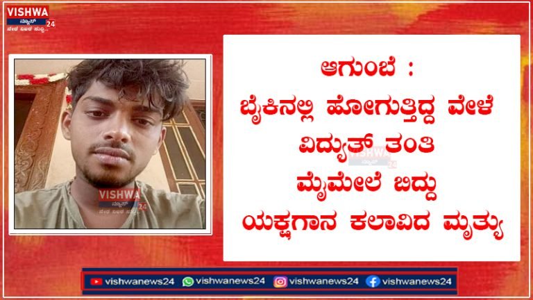 ಚಿಕ್ಕಮಗಳೂರು: ದ್ವಿಚಕ್ರ ವಾಹನದಲ್ಲಿ ಪ್ರಯಾಣಿಸುತ್ತಿದ್ದ ವೇಳೆ ವಿದ್ಯುತ್ ತಂತಿ ಮೈ ಮೇಲೆ ಬಿದ್ದು ಯುವ ಯಕ್ಷಗಾನ ಕಲಾವಿದ ಮೃತಪಟ್ಟ ಘಟನೆ ಆಗುಂಬೆ ಸಮೀಪದ ಕೊಪ್ಪ ಬಳಿ ಸಂಭವಿಸಿದ್ದು, ಹಿಂಬದಿ ಸವಾರ ಪ್ರಾಣಾಪಾಯದಿಂದ ಪಾರಾಗಿದ್ದಾರೆ