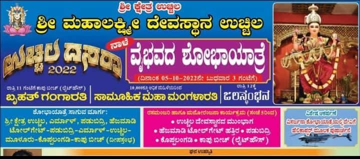 ದಿನಾಂಕ 05.10.2022 ರಂದು ಮಧ್ಯಾಹ್ನ 3 ಗಂಟೆ ಬಳಿಕ ಉಚ್ಚಿಲ ಶ್ರೀ ಮಹಾಲಕ್ಷ್ಮಿ ದೇವಸ್ಥಾನದ ಶೋಭಾಯಾತ್ರೆ ನಡೆಯಲಿದ್ದು ಶೋಭಾಯಾತ್ರೆಯಲ್ಲಿ 100 ಕ್ಕೂ ಹೆಚ್ಚಿನ ಟ್ಯಾಬ್ಲೋ, ಹುಲಿ ವೇಷ, ಭಜನಾ ತಂಡ ವಿವಿಧ ವೇಷಭೂಷಣಗಳು, ಸುಮಾರು 20,000 ಕ್ಕಿಂತ ಹೆಚ್ಚು ಜನರು ಪಾಲ್ಗೊಳ್ಳಲಿದ್ದು, ಶೋಭಾ ಯಾತ್ರೆ ಉಚ್ಚಿಲ ದಿಂದ ಹೆಜಮಾಡಿ ತನಕ ತೆರಳಿ ವಾಪಾಸು ರಾಷ್ಟ್ರೀಯ ಹೆದ್ದಾರಿಯಲ್ಲಿ ಕಾಪು ತನಕ ಸಾಗಲಿದೆ..