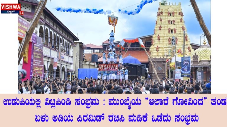Share this on WhatsAppಉಡುಪಿಯಲ್ಲಿ ವಿಟ್ಲಪಿಂಡಿ ಸಂಭ್ರಮ : ಮುಂಬೈಯ “ಆಲಾರೆ ಗೋವಿಂದ” ತಂಡ ಏಳು ಅಡಿಯ ಪಿರಮಿಡ್ ರಚಿಸಿ ಮಡಿಕೆ ಒಡೆದು ಸಂಭ್ರಮ ಉಡುಪಿ: ಉಡುಪಿಯಲ್ಲಿ ವಿಟ್ಲಪಿಂಡಿ ಉತ್ಸವದ ಸಂಭ್ರಮ ನೆಲೆಸಿದೆ. ದೂರದೂರು ಮುಂಬೈಯಿಂದ ಆಗಮಿಸಿದ ಆಲಾರೆ ಗೋವಿಂದ ತಂಡವು … Continue reading ಉಡುಪಿಯಲ್ಲಿ ವಿಟ್ಲಪಿಂಡಿ ಸಂಭ್ರಮ : ಮುಂಬೈಯ “ಆಲಾರೆ ಗೋವಿಂದ” ತಂಡ ಏಳು ಅಡಿಯ ಪಿರಮಿಡ್ ರಚಿಸಿ ಮಡಿಕೆ ಒಡೆದು ಸಂಭ್ರಮ – vishwanews24