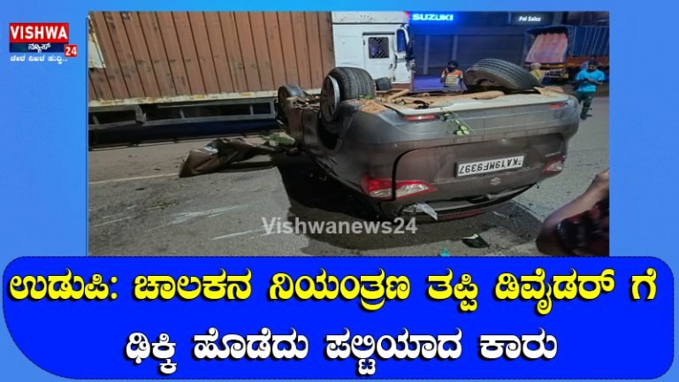 ಉಡುಪಿ: ಅತೀ ವೇಗದಲ್ಲಿ ಸಂಚರಿಸುವಾಗ ಚಾಲಕನ ನಿಯಂತ್ರಣ ತಪ್ಪಿ ಡಿವೈಡರ್ ಗೆ ಢಿಕ್ಕಿ ಹೊಡೆದು ಕಾರು ಪಲ್ಟಿಯಾದ ಘಟನೆ ಉಡುಪಿ ಅಂಬಾಗಿಲುವಿನಲ್ಲಿ ಜೂನ್ 13ರಂದು ನಡೆದಿದೆ.