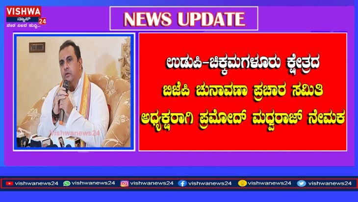 ಉಡುಪಿ-ಚಿಕ್ಕಮಗಳೂರು ಕ್ಷೇತ್ರದ ಬಿಜೆಪಿ ಚುನಾವಣಾ ಪ್ರಚಾರ ಸಮಿತಿ ಅಧ್ಯಕ್ಷರಾಗಿ ಪ್ರಮೋದ್ ಮಧ್ವರಾಜ್ ನೇಮಕ – Vishwanews24