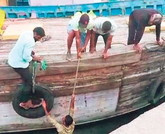 ಉಡುಪಿ,: ಮಲ್ಪೆ ಮೀನುಗಾರಿಕಾ ಬಂದರಿನ ಪಶ್ಚಿಮ ಭಾಗದ ಜೆಟ್ಟಿಯಲ್ಲಿ ಲಂಗರು ಹಾಕಿದ್ದ ದೋಣಿಯಿಂದ ಸಮುದ್ರಕ್ಕೆ ಬಿದ್ದ ಮೀನುಗಾರನನ್ನು ಮುಳುಗು ತಜ್ಞ ಈಶ್ವರ್ ಮಲ್ಪೆ ಅವರು ರಕ್ಷಿಸಿದ್ದಾರೆ.