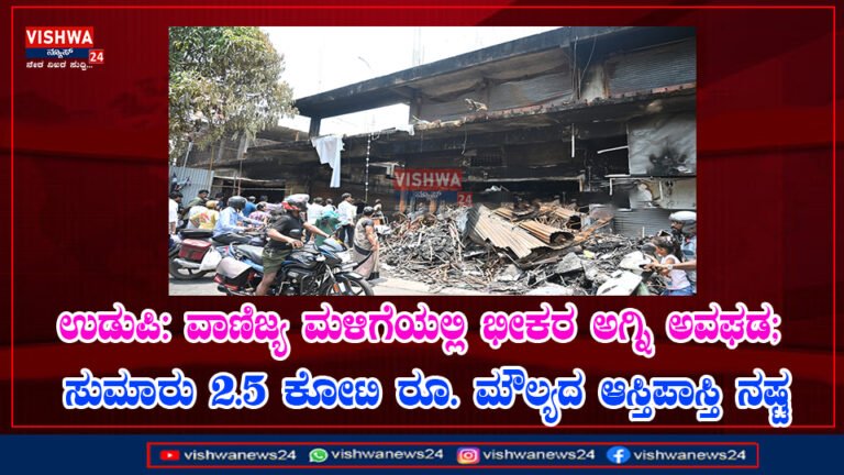 ಉಡುಪಿ: ನಗರದ ಸಿಟಿ ಬಸ್ ನಿಲ್ದಾಣದ ಸಮೀಪವಿರುವ ವಾಣಿಜ್ಯ ಮಳಿಗೆಯೊಂದರಲ್ಲಿ ಭಾನುವಾರ ಸಂಜೆ ಸಂಭವಿಸಿದ ಭೀಕರ ಅಗ್ನಿ ಅವಘಡದಲ್ಲಿ ಸುಮಾರು 2.5 ಕೋಟಿ ರೂಪಾಯಿ ಮೌಲ್ಯದ ಆಸ್ತಿಪಾಸ್ತಿ ನಷ್ಟವಾಗಿದೆ ಎಂದು ಅಂದಾಜಿಸಲಾಗಿದೆ.