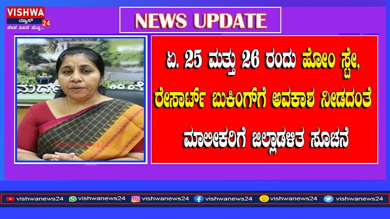 ಏ. 25 ಮತ್ತು 26 ರಂದು ಹೋಂ ಸ್ಟೇ, ರೇಸಾರ್ಟ್ ಬುಕಿಂಗ್ಗೆ ಅವಕಾಶ ನೀಡದಂತೆ ಮಾಲೀಕರಿಗೆ ಜಿಲ್ಲಾಡಳಿತ ಸೂಚನೆ