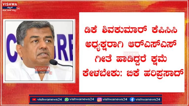 Share this on WhatsAppಡಿಕೆ ಶಿವಕುಮಾರ್ ಕೆಪಿಸಿಸಿ ಅಧ್ಯಕ್ಷರಾಗಿ ಆರ್ಎಸ್ಎಸ್ ಗೀತೆ ಹಾಡಿದ್ದರೆ ಕ್ಷಮೆ ಕೇಳಬೇಕು: ಬಿಕೆ ಹರಿಪ್ರಸಾದ್ ನವದೆಹಲಿ: ಡಿಸಿಎಂ ಆಗಿ ಸಂಘದ ಪ್ರಾರ್ಥನೆ ಹೇಳುವುದರಲ್ಲಿ ಅಭ್ಯಂತರ ಇಲ್ಲ. ಆದರೇ ಕೆಪಿಸಿಸಿ ಅಧ್ಯಕ್ಷರಾಗಿ ಆರ್ಎಸ್ಎಸ್ ಪ್ರಾರ್ಥನೆ ಹಾಡಿದ್ದು ತಪ್ಪು. ಅಧ್ಯಕ್ಷರಾಗಿ ಹೇಳಿದ್ರೆ … Continue reading ಡಿಕೆ ಶಿವಕುಮಾರ್ ಕೆಪಿಸಿಸಿ ಅಧ್ಯಕ್ಷರಾಗಿ ಆರ್ಎಸ್ಎಸ್ ಗೀತೆ ಹಾಡಿದ್ದರೆ ಕ್ಷಮೆ ಕೇಳಬೇಕು: ಬಿಕೆ ಹರಿಪ್ರಸಾದ್ – vishwanews24