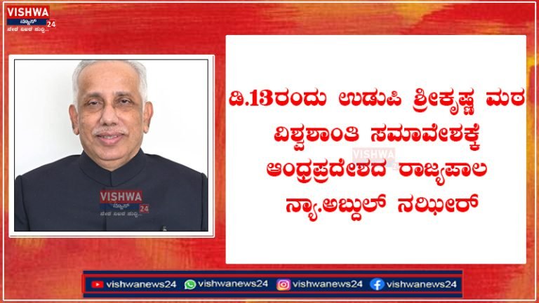 Share this on WhatsAppಡಿ.13ರಂದು ಉಡುಪಿ ಶ್ರೀಕೃಷ್ಣ ಮಠ ವಿಶ್ವಶಾಂತಿ ಸಮಾವೇಶಕ್ಕೆ ಆಂಧ್ರಪ್ರದೇಶದ ರಾಜ್ಯಪಾಲ ನ್ಯಾ.ಅಬ್ದುಲ್ ನಝೀರ್ ಉಡುಪಿ: ಪರ್ಯಾಯ ಪುತ್ತಿಗೆ ಶ್ರೀಕೃಷ್ಣ ಮಠ ಆಶ್ರಯದಲ್ಲಿ ವಿಶ್ವ ಗೀತಾ ಪರ್ಯಾಯ ಸಂದರ್ಭದಲ್ಲಿ ಡಿ.13ರಂದು ರಾಜಾಂಗಣದಲ್ಲಿ ವಿಶ್ವಶಾಂತಿ ಸಮಾವೇಶ ನಡೆಯಲಿದೆ. ಬೆಳಿಗ್ಗೆ 10 … Continue reading ಡಿ.13ರಂದು ಉಡುಪಿ ಶ್ರೀಕೃಷ್ಣ ಮಠ ವಿಶ್ವಶಾಂತಿ ಸಮಾವೇಶಕ್ಕೆ ಆಂಧ್ರಪ್ರದೇಶದ ರಾಜ್ಯಪಾಲ ನ್ಯಾ.ಅಬ್ದುಲ್ ನಝೀರ್ – viswhanews24