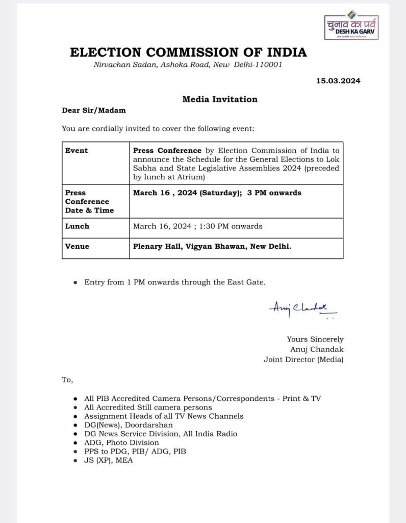 2024 ರ ಸಾರ್ವತ್ರಿಕ ಚುನಾವಣೆ ಮತ್ತು ಕೆಲವು ರಾಜ್ಯಗಳ ಅಸೆಂಬ್ಲಿಗಳ ವೇಳಾಪಟ್ಟಿಯನ್ನು ಪ್ರಕಟಿಸಲು ನಾಳೆ ಮಧ್ಯಾಹ್ನ 3 ಗಂಟೆಗೆ ಚುನಾವಣಾ ಆಯೋಗದ ಪತ್ರಿಕಾಗೋಷ್ಠಿ ಕರೆದಿದೆ.