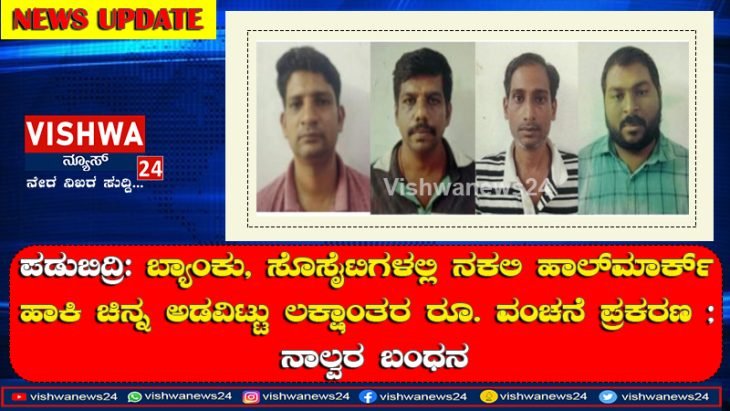 ಪಡುಬಿದ್ರಿ: ಬ್ಯಾಂಕು, ಸೊಸೈಟಿಗಳಲ್ಲಿ ನಕಲಿ ಹಾಲ್ಮಾರ್ಕ್ ಹಾಕಿ ಚಿನ್ನ ಅಡವಿಟ್ಟು ಲಕ್ಷಾಂತರ ರೂ. ವಂಚನೆ ಪ್ರಕರಣ ; ನಾಲ್ವರ ಬಂಧನ – Vishwanews24