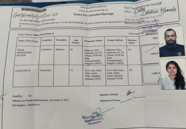 ಪುತ್ತೂರಿನ ದರ್ಬೆ ನಿವಾಸಿ ಅಕ್ಷತಾ (34) ಎಂಬಾಕೆ ಬೆಂಗಳೂರಿನ ನ್ಯಾಣಪ್ಪನಹಳ್ಳಿ ನಿವಾಸಿ ಶೇಕ್ ಮಹಮ್ಮದ್ ಸಲೀಂ (44) ಎಂಬಾತನನ್ನು ನವೆಂಬರ್ 9ರಂದು ಮದುವೆಯಾಗಿದ್ದಾರೆ. ಈ ಬಗ್ಗೆ ಬೊಮ್ಮನಹಳ್ಳಿ ರಿಜಿಸ್ಟಾರ್ ಕೇಂದ್ರದಲ್ಲಿ ವಿವಾಹ ನೋಂದಣಿಯಾಗಿದೆ. ಸದ್ಯ ಈ ನೋಟಿಸ್ ಎಲ್ಲೆಡೆ ಹರಿದಾಡುತ್ತಿದ್ದು ವ್ಯಾಪಕ ವಿರೋಧ ವ್ಯಕ್ತವಾಗಿದೆ.