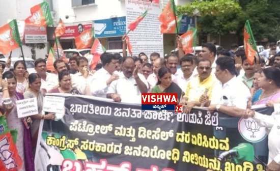 ಉಡುಪಿ: ಪೆಟ್ರೋಲ್, ಡೀಸೆಲ್ ದರ ಏರಿಕೆ ಖಂಡಿಸಿ ಸೋಮವಾರ ರಾಜ್ಯ ಸರಕಾರದ ವಿರುದ್ಧ ಉಡುಪಿ ಜಿಲ್ಲಾ ಬಿಜೆಪಿಯಿಂದ ಜಿಲ್ಲಾ ಕಚೇರಿಯ ಬಳಿ ಬೃಹತ್ ಪ್ರತಿಭಟನೆ ನಡೆಯಿತು.