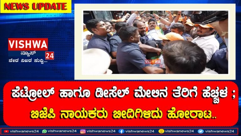 Share this on WhatsAppಪೆಟ್ರೋಲ್ ಹಾಗೂ ಡೀಸೆಲ್ ಮೇಲಿನ ತೆರಿಗೆ ಹೆಚ್ಚಳ ಮಾಡಿದ್ದಕ್ಕಾಗಿ ಬಿಜೆಪಿ ನಾಯಕರು ಬೀದಿಗಿಳಿದು ಹೋರಾಟ.. ಬಿಜೆಪಿ ಕಚೇರಿಯಿಂದ ವಿಧಾನಸೌಧದವರೆಗೆ ಸೈಕಲ್ ಜಾಥಾ.. ಬಿ.ವೈ ವಿಜಯೇಂದ್ರ ಸೇರಿ ಬಿಜೆಪಿ ನಾಯಕರು ಪೊಲೀಸ್ ವಶಕ್ಕೆ.. ಬೆಂಗಳೂರು : ಪೆಟ್ರೋಲ್, ಡೀಸೆಲ್ … Continue reading ಪೆಟ್ರೋಲ್, ಡೀಸೆಲ್ ಬೆಲೆ ಏರಿಕೆ ಖಂಡಿಸಿ ಪ್ರತಿಭಟನೆ : ಬಿ.ವೈ ವಿಜಯೇಂದ್ರ ಸೇರಿ ಬಿಜೆಪಿ ನಾಯಕರು ಪೊಲೀಸ್ ವಶಕ್ಕೆ – vishwanews24