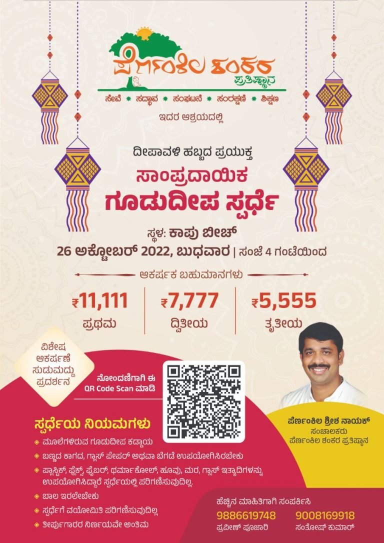 ಕಾಪು: ಪೆರ್ಣಂಕಿಲ ಶಂಕರ ಪ್ರತಿಷ್ಠಾನ ಇದರ ಆಶ್ರಯದಲ್ಲಿ ಪೆರ್ಣಂಕಿಲ ಶ್ರೀಶ ನಾಯಕ್ ಇವರ ನೇತೃತ್ವದಲ್ಲಿ ದೀಪಾವಳಿ ಹಬ್ಬದ ಪ್ರಯುಕ್ತ ಸಾಂಪ್ರದಾಯಿಕ ಗೂಡು ದೀಪ ಸ್ಪರ್ಧೆ 26 ಅಕ್ಟೋಬರ್ 2022ನೇ ಬುಧವಾರ ಸಂಜೆ ನಾಲ್ಕು ಗಂಟೆಗೆ ಕಾಪು ಬೀಚ್ ವಠಾರದಲ್ಲಿ ನಡೆಯಲಿದೆ.