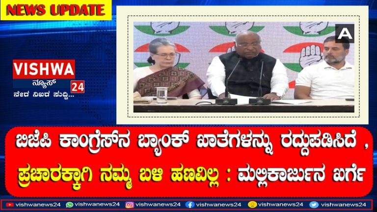 Share this on WhatsAppಬಿಜೆಪಿ ಕಾಂಗ್ರೆಸ್ನ ಬ್ಯಾಂಕ್ ಖಾತೆಗಳನ್ನು ರದ್ದುಪಡಿಸಿದೆ , ಪ್ರಚಾರಕ್ಕಾಗಿ ನಮ್ಮ ಬಳಿ ಹಣವಿಲ್ಲ : ಮಲ್ಲಿಕಾರ್ಜುನ ಖರ್ಗೆ ಬಿಜೆಪಿ ತಪ್ಪಾಗಿ ದೇಣಿಗೆ ಪಡೆದು ತನ್ನ ಬೊಕ್ಕಸ ತುಂಬಿಕೊಂಡಿದ್ದು, ಇದೀಗ ಕಾಂಗ್ರೆಸ್ನ ಬ್ಯಾಂಕ್ ಖಾತೆಗಳನ್ನು ರದ್ದುಪಡಿಸಿದೆ ಎಂದು ಕಾಂಗ್ರೆಸ್ … Continue reading ಬಿಜೆಪಿ ಕಾಂಗ್ರೆಸ್ನ ಬ್ಯಾಂಕ್ ಖಾತೆಗಳನ್ನು ರದ್ದುಪಡಿಸಿದೆ , ಪ್ರಚಾರಕ್ಕಾಗಿ ನಮ್ಮ ಬಳಿ ಹಣವಿಲ್ಲ : ಮಲ್ಲಿಕಾರ್ಜುನ ಖರ್ಗೆ – Vishwanews24