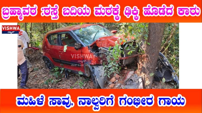 ಬ್ರಹ್ಮಾವರ : ಚಾಲಕನ ನಿಯಂತ್ರಣ ತಪ್ಪಿದ ಕಾರೊಂದು ರಸ್ತೆ ಬದಿಯ ಮರಕ್ಕೆ ಢಿಕ್ಕಿ ಹೊಡೆದ ಪರಿಣಾಮ ಮಹಿಳೆಯೊಬ್ಬರು ಸಾವನ್ನಪ್ಪಿದ್ದು, ನಾಲ್ವರಿಗೆ ಗಂಭೀರ ಗಾಯಗಳಾಗಿವೆ.
