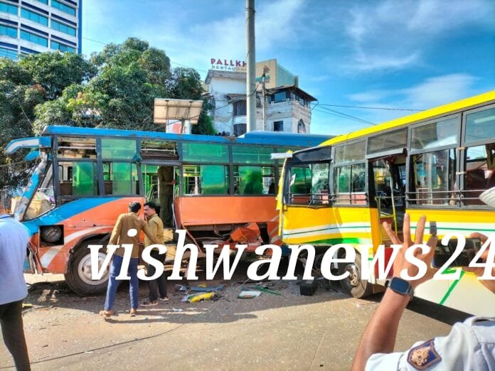 ಮಂಗಳೂರು: ಜ್ಯೋತಿ ಸರ್ಕಲ್ ಬಳಿ ಎರಡು ಖಾಸಗಿ ಬಸ್‌ಗಳ ನಡುವೆ ಅಪಘಾತ : ಪ್ರಯಾಣಿಕರು ಅಪಾಯದಿಂದ ಪಾರು – Vishwanews24
