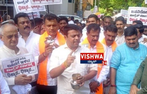 ಮಂಗಳೂರು: ರಾಜ್ಯ ಸರಕಾರ ಪೆಟ್ರೋಲ್, ಡೀಸೆಲ್ ಬೆಲೆ ಏರಿಸಿರುವುದನ್ನು ಖಂಡಿಸಿ ಬಿಜೆಪಿ ಕಾರ್ಯಕರ್ತರು ಮಂಗಳೂರಿನಲ್ಲಿ ವಿಭಿನ್ನ ರೀತಿಯಲ್ಲಿ ಪ್ರತಿಭಟನೆ ನಡೆಸಿದರು.