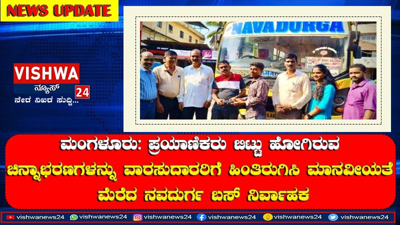 ಮಂಗಳೂರು: ಪ್ರಯಾಣಿಕರು ಬಿಟ್ಟು ಹೋಗಿರುವ ಚಿನ್ನಾಭರಣಗಳನ್ನು ವಾರಸುದಾರರಿಗೆ ಹಿಂತಿರುಗಿಸಿ ಪ್ರಾಮಾಣಿಕತೆ ಹಾಗೂ ಮಾನವೀಯತೆ ಮೆರೆದ ನವದುರ್ಗ ಬಸ್ ನಿರ್ವಾಹಕ – Vishwanews24