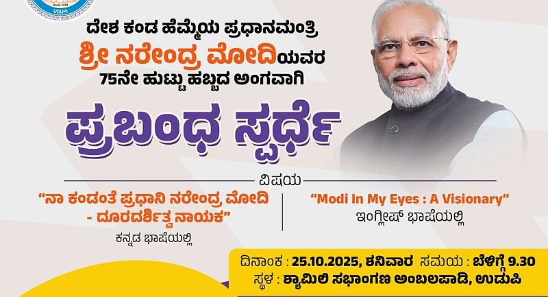 ಮಹಾಲಕ್ಷ್ಮೀ ಕೋ ಆಪರೇಟಿವ್ ಬ್ಯಾಂಕ್ ವತಿಯಿಂದ ಪ್ರಧಾನಿ ನರೇಂದ್ರ ಮೋದಿಯವರ 75ನೇ ಹುಟ್ಟುಹಬ್ಬದ ಅಂಗವಾಗಿ ಅಕ್ಟೋಬರ್ 11ರಂದು ಉಡುಪಿ ಶ್ಯಾಮಿಲಿ ಸಭಾಂಗಣದಲ್ಲಿ ಆಯೋಜಿಸಿದ್ದ ಉಡುಪಿ ಮತ್ತು ದಕ್ಷಿಣ ಕನ್ನಡ ಜಿಲ್ಲಾ ಮಟ್ಟದ ವಿದ್ಯಾರ್ಥಿಗಳಿಗೆ ಪ್ರಬಂಧ ಸ್ಪರ್ಧೆಯನ್ನು ಅಕ್ಟೋಬರ್ 25 ಕ್ಕೆ ಮುಂದೂಡಲಾಗಿದೆ ಎಂದು ಬ್ಯಾಂಕಿನ ಅಧ್ಯಕ್ಷರಾದ ಉಡುಪಿ ಶಾಸಕ ಯಶ್ ಪಾಲ್ ಸುವರ್ಣ ತಿಳಿಸಿದ್ದಾರೆ.