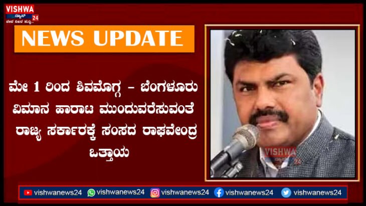 ಮೇ 1 ರಿಂದ ಶಿವಮೊಗ್ಗ – ಬೆಂಗಳೂರು ವಿಮಾನ ಹಾರಾಟ ಮುಂದುವರೆಸುವಂತೆ ರಾಜ್ಯ ಸರ್ಕಾರಕ್ಕೆ ಸಂಸದ ರಾಘವೇಂದ್ರ ಒತ್ತಾಯ – vishwanews24
