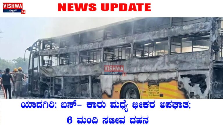ಸುರಪುರ : ಬಸ್ ಮತ್ತು ಕಾರಿನ ಮಧ್ಯೆ ಉಂಟಾದ ಭೀಕರ ಅಪಘಾತದಲ್ಲಿ6 ಮಂದಿ ಸಜೀವ ದಹನವಾಗಿರುವ ಘಟನೆ ತಾಲೂಕಿನ ತಿಂಥಣಿ ಸೇತುವೆ ಬಳಿಯ ಶಾಂತಪುರ ಕ್ರಾಸ್ ಹತ್ತಿರ ಬೀದರ್ ಬೆಂಗಳೂರು ಹೆದ್ದಾರಿಯಲ್ಲಿ ಶುಕ್ರವಾರ ಬೆಳಗ್ಗೆ ನಡೆದಿದೆ.
