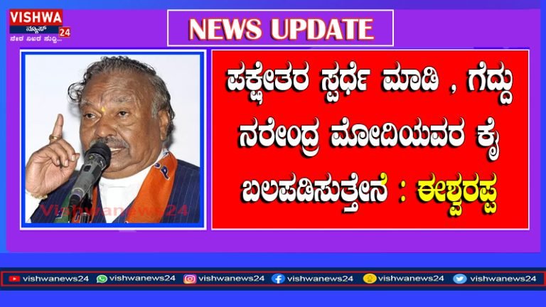 Share this on WhatsAppಪಕ್ಷೇತರ ಸ್ಪರ್ಧೆ ಮಾಡಿ , ಗೆದ್ದು ನರೇಂದ್ರ ಮೋದಿಯವರ ಕೈ ಬಲಪಡಿಸುತ್ತೇನೆ : ಈಶ್ವರಪ್ಪ ಶಿವಮೊಗ್ಗ,: ಲೋಕಸಭಾ ಚುನಾವಣೆಯಲ್ಲಿ ಶಿವಮೊಗ್ಗ ಕ್ಷೇತ್ರದಿಂದ ಸ್ವತಂತ್ರ ಅಭ್ಯರ್ಥಿಯಾಗಿ ಸ್ಪರ್ಧಿಸುವುದಾಗಿ ಘೋಷಿಸಿರುವ ಹಿನ್ನೆಲೆಯಲ್ಲಿ ಮಾಜಿ ಉಪ ಮುಖ್ಯಮಂತ್ರಿ ಕೆ.ಎಸ್.ಈಶ್ವರಪ್ಪರ ಮನವೊಲಿಸುವ ಸಂಘ … Continue reading ಯಾವುದೇ ಕಾರಣಕ್ಕೂ ಚುನಾವಣಾ ಕಣದಿಂದ ನಾನು ಹಿಂದೆ ಸರಿಯಲ್ಲ : ಈಶ್ವರಪ್ಪ – Vishwanews24