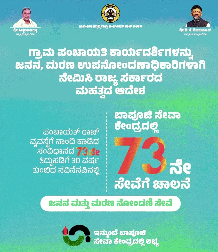 ಪಂಚಾಯತ್ ರಾಜ್ ವ್ಯವಸ್ಥೆಗೆ ನಾಂದಿ ಹಾಡಿದ ಸಂವಿಧಾನದ 73ನೇ ತಿದ್ದುಪಡಿಗೆ 30 ವರ್ಷಗಳು ತುಂಬಿದ ಸವಿನೆನಪಿನಲ್ಲಿ ಗ್ರಾಮ ಪಂಚಾಯತಿ ಕಾರ್ಯದರ್ಶಿಗಳನ್ನು ಜನನ, ಮರಣ ಉಪನೋಂದಣಾಧಿಕಾರಿಗಳಾಗಿ ನೇಮಿಸಿ ಸರ್ಕಾರ ಆದೇಶಿಸಿದೆ. ಈ ಮೂಲಕ ಜನನ – ಮರಣ ಪ್ರಮಾಣಪತ್ರ ಪಡೆಯುವುದು ಇನ್ನಷ್ಟು ಸುಲಭವಾಗಿದೆ.