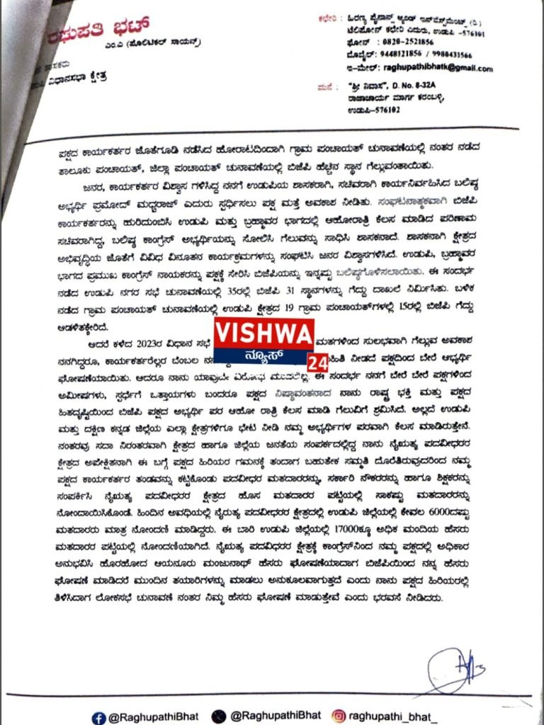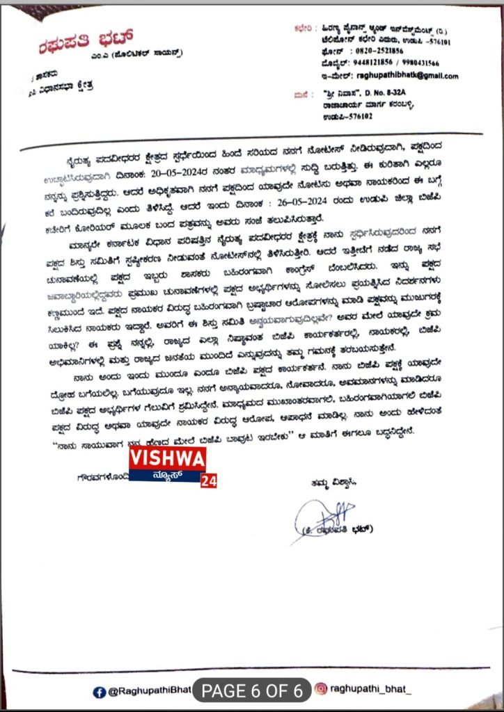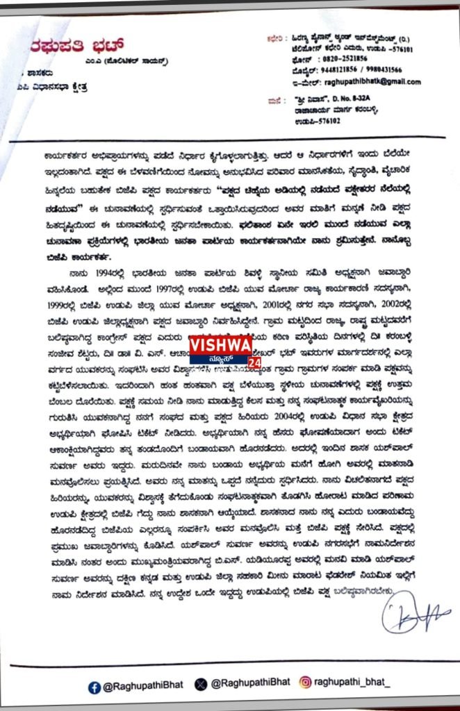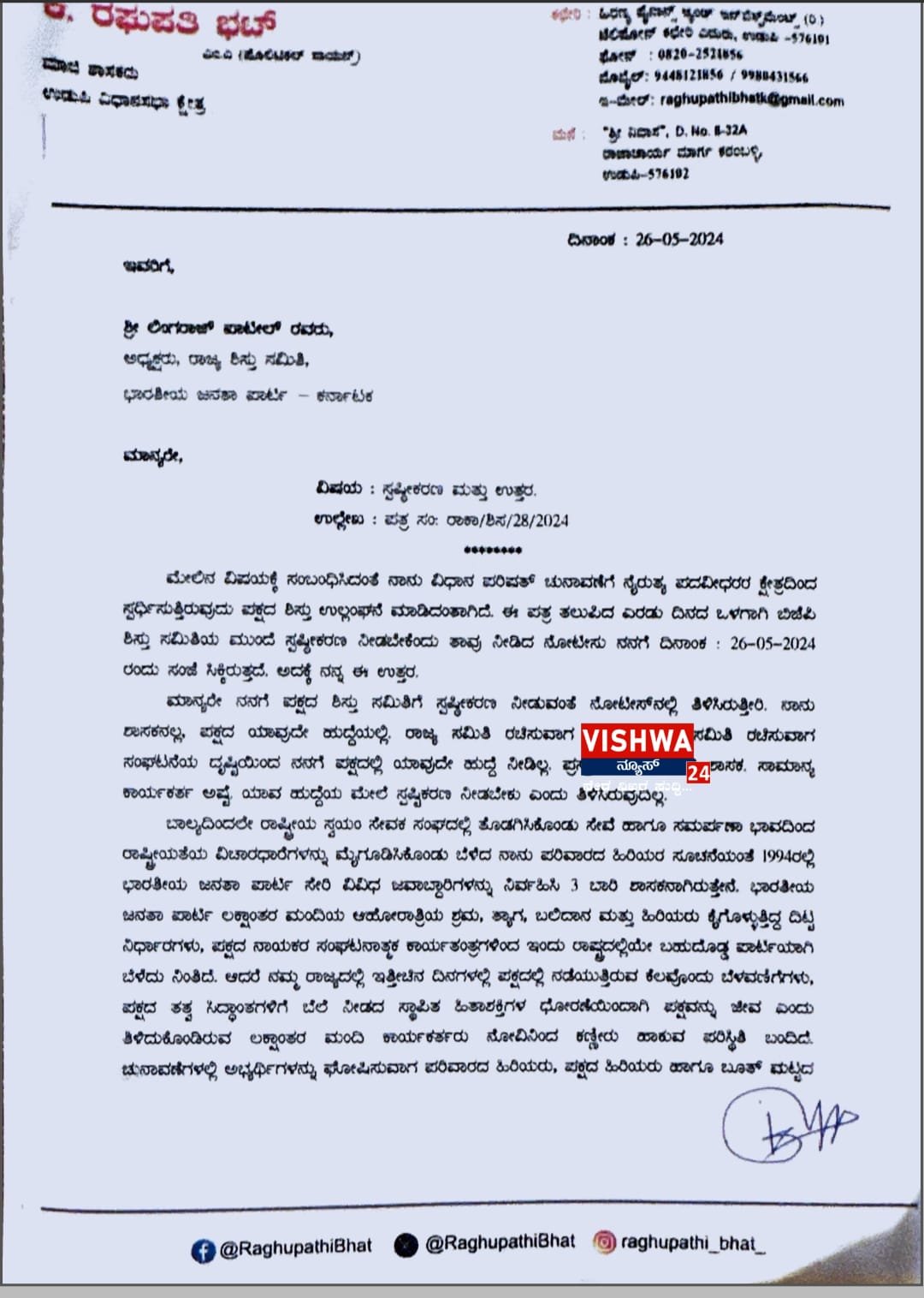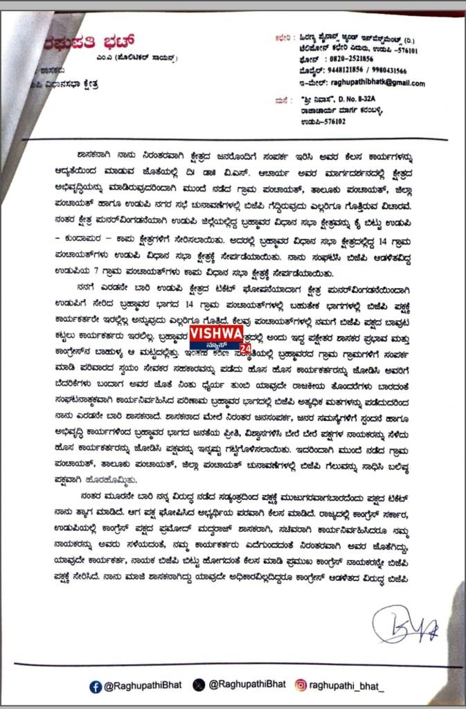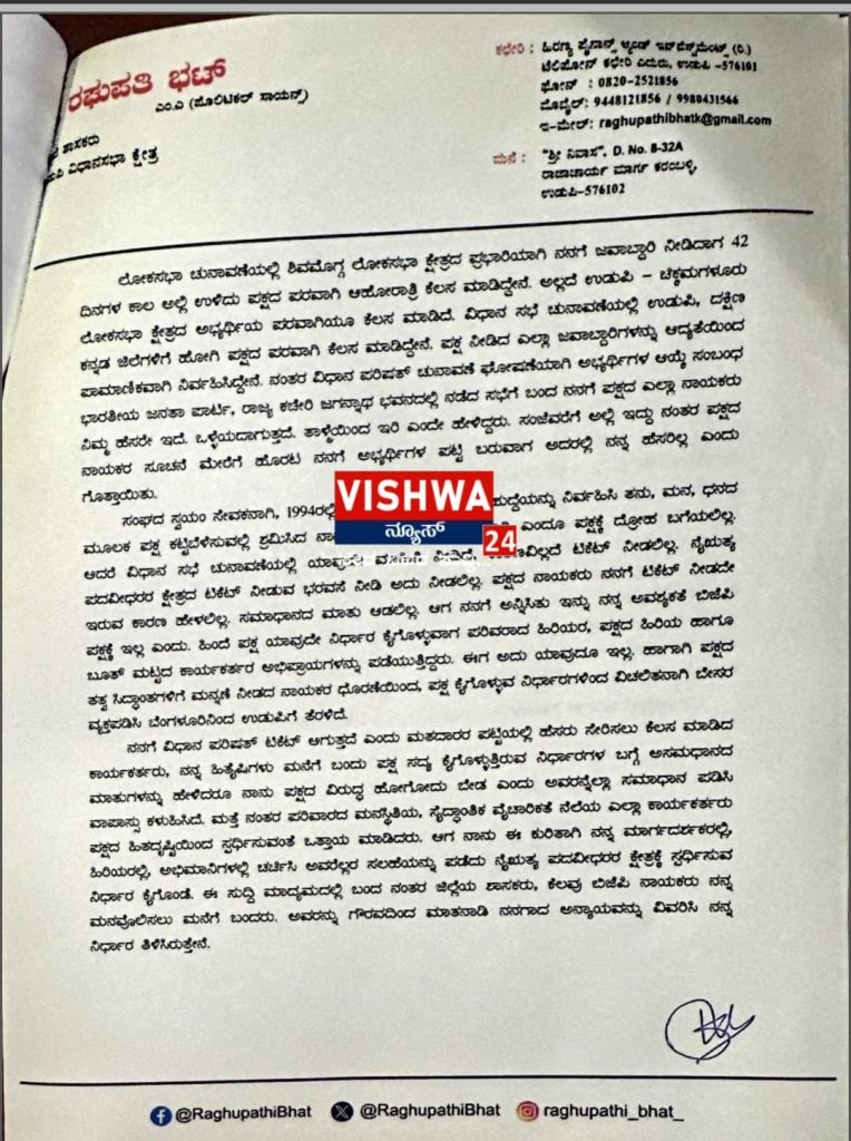 ರಾಜ್ಯ ಬಿಜೆಪಿಗೆ 6 ಪುಟಗಳ ಅತ್ಯಂತ ಭಾವನಾತ್ಮಕ ಪತ್ರ ಬರೆದ ರಘುಪತಿ ಭಟ್ : vishwanews24 EXCLUSIVE