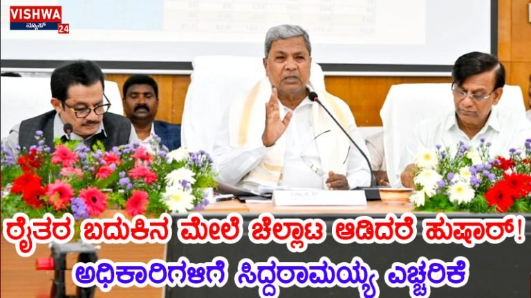 Share this on WhatsApp ರೈತರ ಬದುಕಿನ ಮೇಲೆ ಚೆಲ್ಲಾಟ ಆಡಿದರೆ ಹುಷಾರ್! ಅಧಿಕಾರಿಗಳಿಗೆ ಸಿದ್ದರಾಮಯ್ಯ ಎಚ್ಚರಿಕೆ * ಬರ ಪರಿಹಾರ 130 ಕೋಟಿ ರೂ. ವಿತರಣೆ * ಆತ್ಮಹತ್ಯೆ ಮಾಡಿಕೊಂಡ ರೈತರಿಗೆ ಪರಿಹಾರ ವಿಳಂಬ, CM ತರಾಟೆ * ಕೆರೆ … Continue reading ರೈತರಿಂದ ದೂರು ಬಂದರೆ ಅಧಿಕಾರಿಗಳ ವಿರುದ್ಧ ಶಿಸ್ತು ಕ್ರಮ ಕೈಗೊಳ್ಳುವುದು ಖಚಿತ : ಮುಖ್ಯಮಂತ್ರಿ ಎಚ್ಚರಿಕೆ – vishwanews24