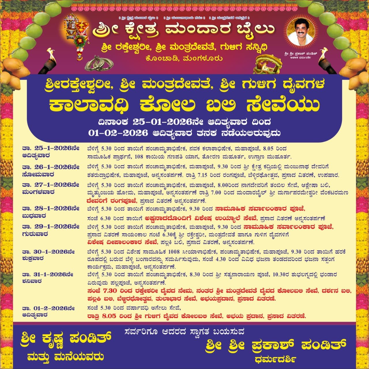 27 ಜನವರಿ ಮಂಗಳವಾರ ನಾಗದೇವರಿಗೆ ತಂಬಿಲಾ ಸೇವೆ ,ಆಶ್ಲೇಷಾ ಬಲಿ ,ಮೃತ್ಯುಂಜಯ ಹೋಮ,ರಾತ್ರಿ ಮಂದಾರ ಬಯಲು ಶ್ರೀ ದುರ್ಗಾಪರಮೇಶ್ವರಿ ವೆಂಕಟರಮಣ ದೇವರಿಗೆ ರಂಗ ಪೂಜೆ, 28ನೇ ಬುಧವಾರ